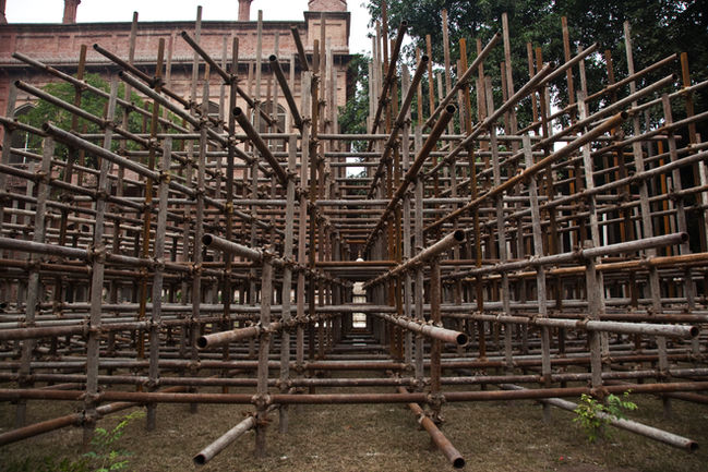 The association with scaffolding and its purpose generally means an armature, or even a temporary support to help build or fix something. The scaffolding was constructed outside an existing monument of great value, the National College of Arts(NCA) courtyard Fountain. The values and meanings associated with the fountain and its design are important here. It was designed to be a drinking fountain by an outstanding student and later teacher of the formal Mayo School of Arts, Rai Bhahadur Ram Singh around 1911.The Mayo School of Arts now known as the National College of Arts was designed and built at the time when the Indian Subcontinent was under the British Raj. The white marble fountain is still significantly situated in the heart of the college. Many of the heritage buildings on the Mall Road Lahore are the architectural designs of Ram Singh.